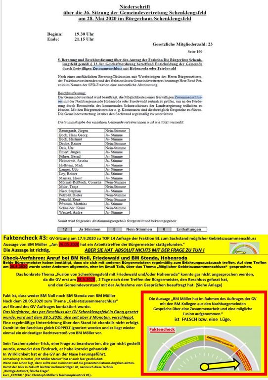 Ein Faktencheck aus 2020 hat ergeben, dass BM Möller vor der GV über seine Ausführung des Beschlusses - höflich gesagt - "nicht ganz den Kern der Frage getroffen hat". Es wird in 2024 interessant werden, wie der damalige BL-Abgeordnete und designierte Bürgermeister Andre Wenzel diese Thematik angehen wird. Als gesichert kann zumindest vermutet werden, dass sich eine Gemeinde unter 5.000 Einwohner sich keinen eigenen Bürgermeister/in leisten werden kann.