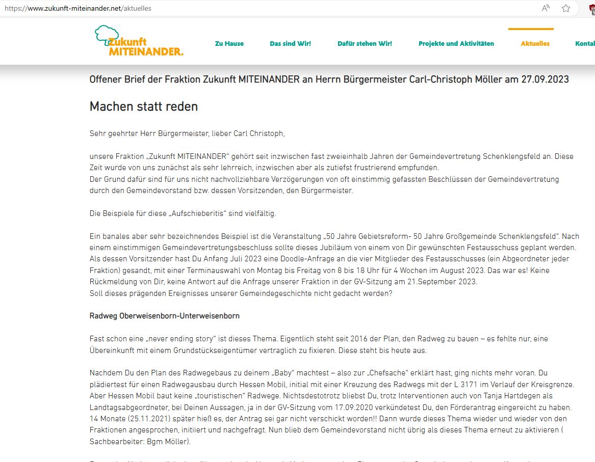 Im September 2023 hat die Fraktion "Zukunft-MITEINANDER" einen "Offenen Brief an Bürgermeister Carl Christoph Möller" veröffentlicht. Hier der LINK zur PDF-Version : https://www.zukunft-miteinander.net/_files/ugd/5455b5_9d10d3448dee48d7af71a42f4bb07ba5.pdf und ein LINK zur "Kläranlage Malkomes" https://www.zukunft-miteinander.net/_files/ugd/5455b5_be9ee7ce4c6c43bdbf60d19225dfeb09.pdf |