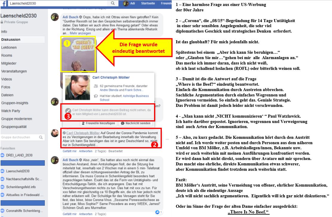Die Frage, die ich bereits am 20.06.2020 in FB-Laenscheld2030 gestellt hatte war, in Anlehnung an einen US-Werbespot aus den 80er Jahren "Where is the Beef?" - "Wo ist das Fleisch?" Ohne Planung, Planungs-Kontrolle, Erfolgreiche Zwischenziele, Ergebnisse, Projekt-Abschlüsse usw. sind Aktionen nichts wert; Luftschlösser, Wolkenkuckucksheime, (Alb)-Träume - alles OHNE FLEISCH. Ich hatte damals die Frage in Zusammenhang mit dem GV-Beschluss zur Aufnahme von möglichen Fusions-Gesprächen mit Friedewald und Hohenroda gestellt.