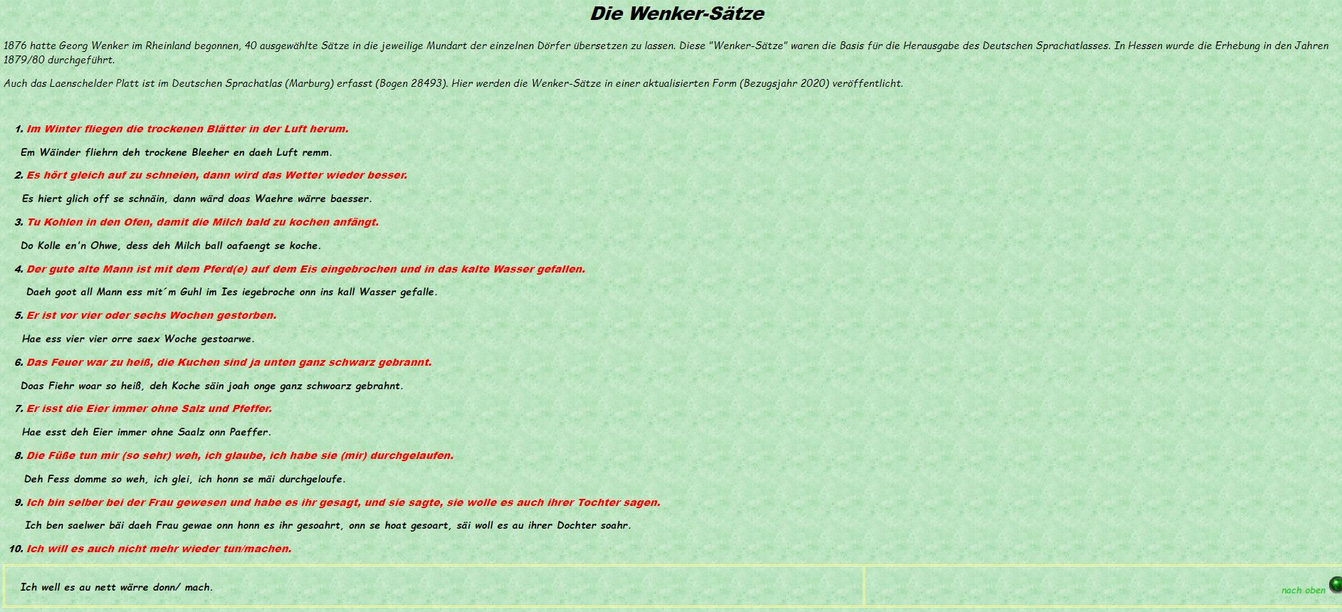 Teilprojekt: Sammlung von Sprachbeispielen Teilprojekt-Leiter: Adi Busch und weitere Freiwillige Kontakt: LAEN-PLATT@BISS2030.de Ziel: Sammlung von Sprachbeispielen von Sprecher*innen mit Laenschelder Platt als MUTTERSPRACHE. Dokument: WENKER-Sätze - Sprachwissenschaftliche MUSTERSÄTZE, mit denen Linguisten die Entwicklung von Sprachen wissenschaftlich untersuchen. Teil-Autoren: Unterschiedliche Sprecher*innen, die die Sätze in ihrem Dialekt nachsprechen. | |