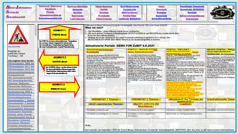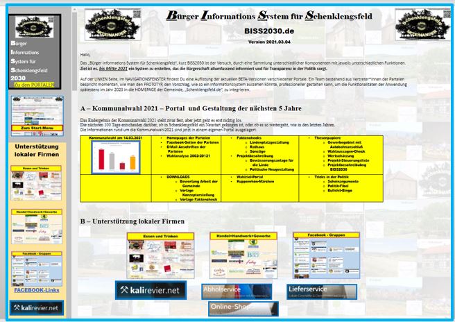 Das "Bürger Informations System für Schenklengsfeld", BISS, wurde seit 2019 auf verschiedenen Plattformen entwickelt. Über dieses Menu können Leser*innen sich nochmal die alten Strukturen ansehen. Die Versionen werden nach und nach zurück gebaut und in die aktuelle BISS2030-Version eingebaut.