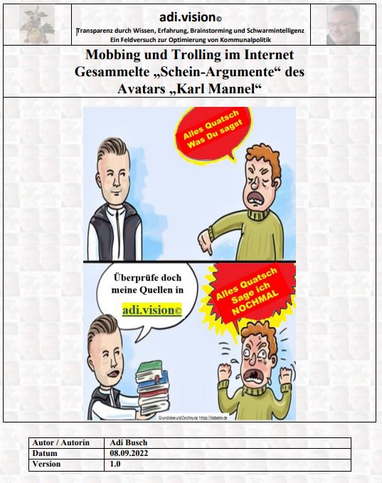 08.09.2022 | FB BISS2030 | Busch/Avatar Mannel | "Hommage" an die Aktivitäten und Beiträge des AVATAR "Karl Mannel" in der ursprünglichen Version. Meine Art mit dem MOBBING umzugehen war und ist es, den AVATAR bzw. TROLL als das armselige Wesen darzustellen, was er ist, mich über ihn lustig zu machen und das auch öffentlich zu machen. | Dass im Netz geTROLLt und geHATEt wird, ist allgemein bekannt. Gerade jüngere Menschen leiden oft an diesen TOXISCHEN ANGRIFFEN von PFEIFEN. Dieses Dokument soll Menschen, die GEMOBBT werden MUT MACHEN, sich zu wehren. | |