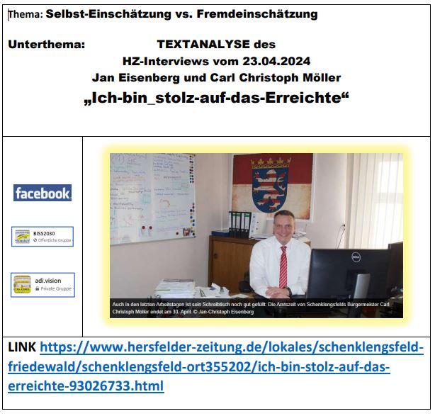 25.04.2024 | HZ | BM Möller JC Eisenberg Adi Busch | Abschließende Selbst-Beurteilung der Arbeit von 2018-2014 durch Bürgermeister Carl Christoph Möller | Für das PROFILING-PORTAL: Selbsteinschätzung vs. Fremdeinschätzung Faktenchecks und Hintergrund-Infos zu den Aussagen im Text | |