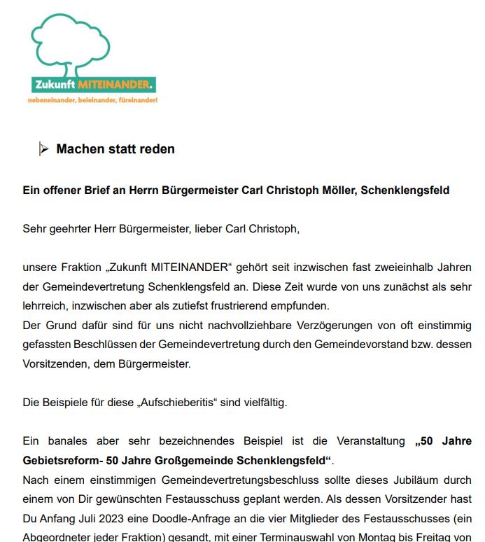27.09.2023 | Offener Brief von Zukunft MITEINANDER | Dr.Frank Klein Beate Lüders Matthias Vollmer | Aufdeckung/Veröffentlichung von Projektständen, die eklatante Lücken in Projekten der Gemeinde aufzeigen.
