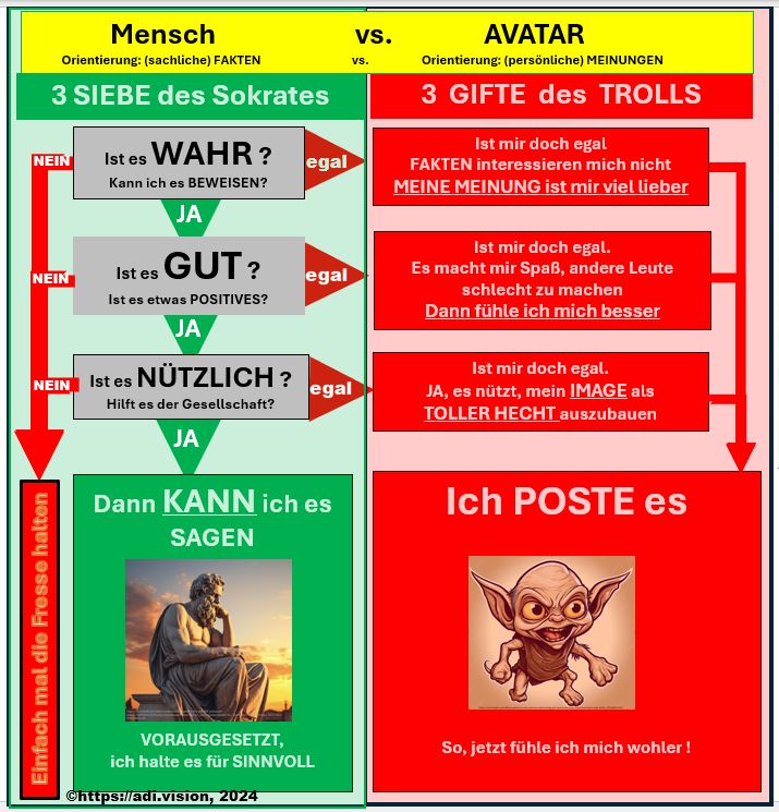 | FB BISS2030 | Busch/Avatar Mannel | Ursprünglich: Ankündigung einer neuen adi.vision-Struktur Der Kommentar des AVATAR "Karl Mannel" hat dann alle Inhalte meines Beitrages ignoriert und hat mich sofort AD-HOMINEM angegriffen. Das war gut so, denn dadurch hat er MEINE THESEN zu SEINEM TOXISCHES VERHALTEN voll umfänglich bestätigt.;-) | Aufdecken von TOXISCHEN TROLL-Aktionen eines AVATARS und Aufzeigen von Möglichkeiten, die man als Einzelne/r hat, sich gegen TROLLEREIEN und MOBBING effektiv zu WEHREN. | |