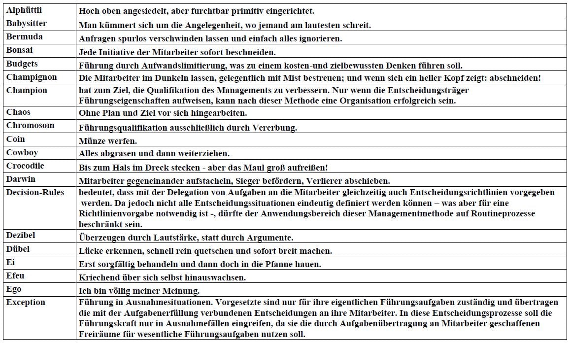 m Anhang findet ihr eine Sammlung von „Managemenzt by…“ Varianten. Manche davon sind Methoden nach Lehrbuch, andere sind Methoden nach Projekterfahrung. Eine Methode ist noch nicht definiert.