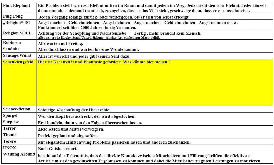 Im Laufe der Zeit habe ich mir eine kleine Liste von Beschreibungen angelegt, die in verschiedenen meiner Projekte das Kernproblem sichtbar gemacht haben. Dazu habe ich gängige Lehrbegriffe aus dem Management-Training (Management by…) je nach Projektsituation erweitert und im Team diskutiert.