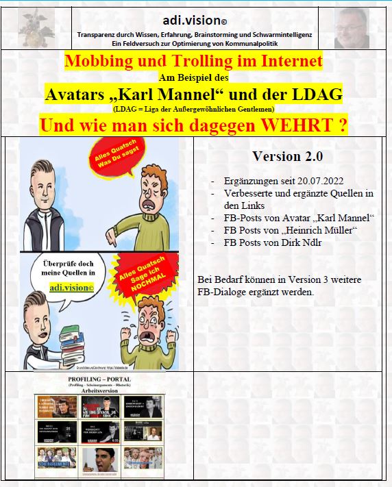 Das Projekt "adi.vision" hat seit 2018 Daten gesammelt. In dieser Zeit wurden auf kommunaler Ebene eine Menge Tricks aus den Bereichen Rhetorik, Psychologie, Jura und mehr identifiziert, analysiert und dokumentiert. Diese Dokumente beschreiben die "Mobbing-Techniken"