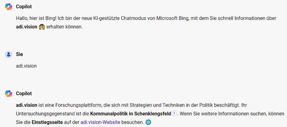 | "adi.vision" ist eine Forschungs-plattform, die sich mit Strategien und Techniken in der Politik beschäftigt. Ihre Untersuchungs-gegenstand ist die Kommunalpolitik Schenklengsfeld (KI Bing Copilot) |